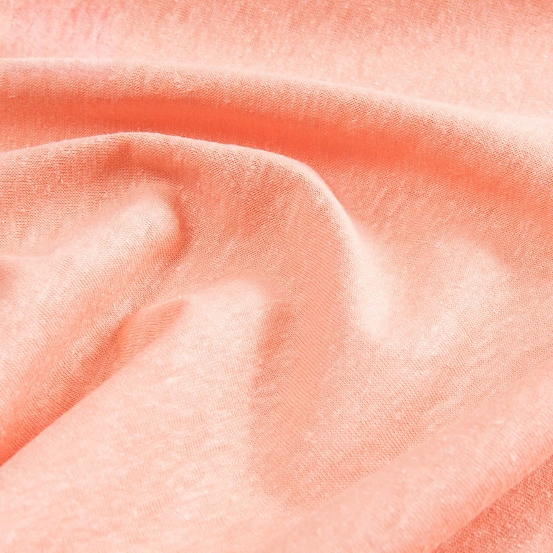 The single jersey construction provides a smooth face and a slightly textured back, ensuring good drape and ease of wear. This fabric is particularly suitable for summer apparel, offering a balance between airflow, comfort, and structural stability during garment production. It performs well in T-shirt manufacturing and casualwear collections where natural fiber content and comfort are key priorities.