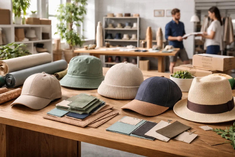 Recycled polyester and organic cotton are the most widely used materials because they balance sustainability, durability, and cost. Hemp, bamboo, cork, and natural straw are also popular for more premium or niche hat styles.
